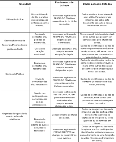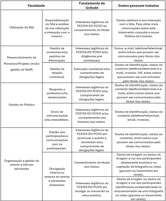 Nas suas interações com a FESTAS DO POVO poderá disponibilizar-nos dados pessoais, que iremos tratar para finalidades específicas.